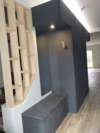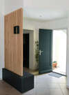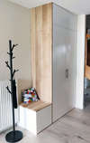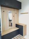 Façades meubles en valchromat noir, plateaux et tasseaux en placage chêne, patères noir et or brossé.