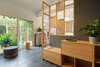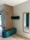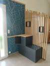 Miroir cadré en chêne massif, claustra en chêne massif : finiton du bois= huilé chêne clair.